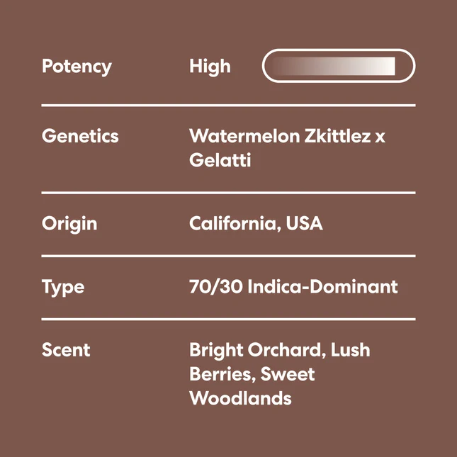 Mit einem beeindruckend hohen THC-Gehalt von 27,49% entfaltet diese Indica-dominante Sorte ihre volle, beruhigende Kraft. Der Körper sinkt in einen Zustand tiefer Entspannung, während die Gedanken zur Ruhe kommen. Das Geschmackserlebnis ist ebenso exklusiv: eine verführerische Mischung aus süßen Beeren und der cremigen Süße von Gelato, die jeden Zug zu einem luxuriösen Genuss macht.