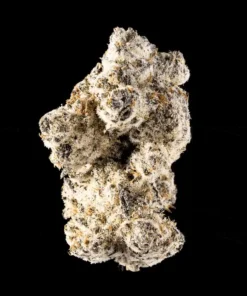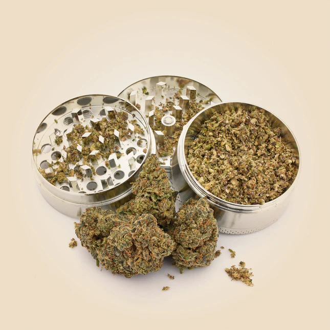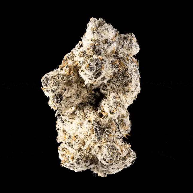 Exotische Optik: Die Blüten bestechen durch ihre silberfarbenen, orange-grünen Strukturen, die dicht mit glitzernden Trichomen bedeckt sind – ein Zeichen höchster Qualität und Potenz.