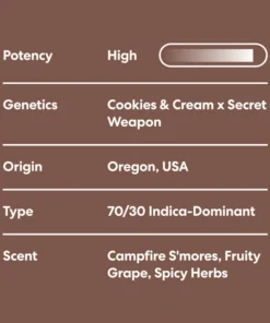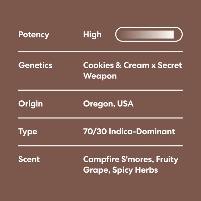 Genieße das exotische Erbe der Oreoz Genetik. Mit einem beeindruckenden THC-Gehalt von 27,58 % und einem reichhaltigen, süßen Aroma, das an S’mores erinnert, bietet diese Indica-dominante Hybride ein sanftes und geschmackvolles Erlebnis. Die silbrig beschichteten, klebrigen Buds schmelzen den Stress weg und versetzen dich in einen Zustand wohliger Ruhe.